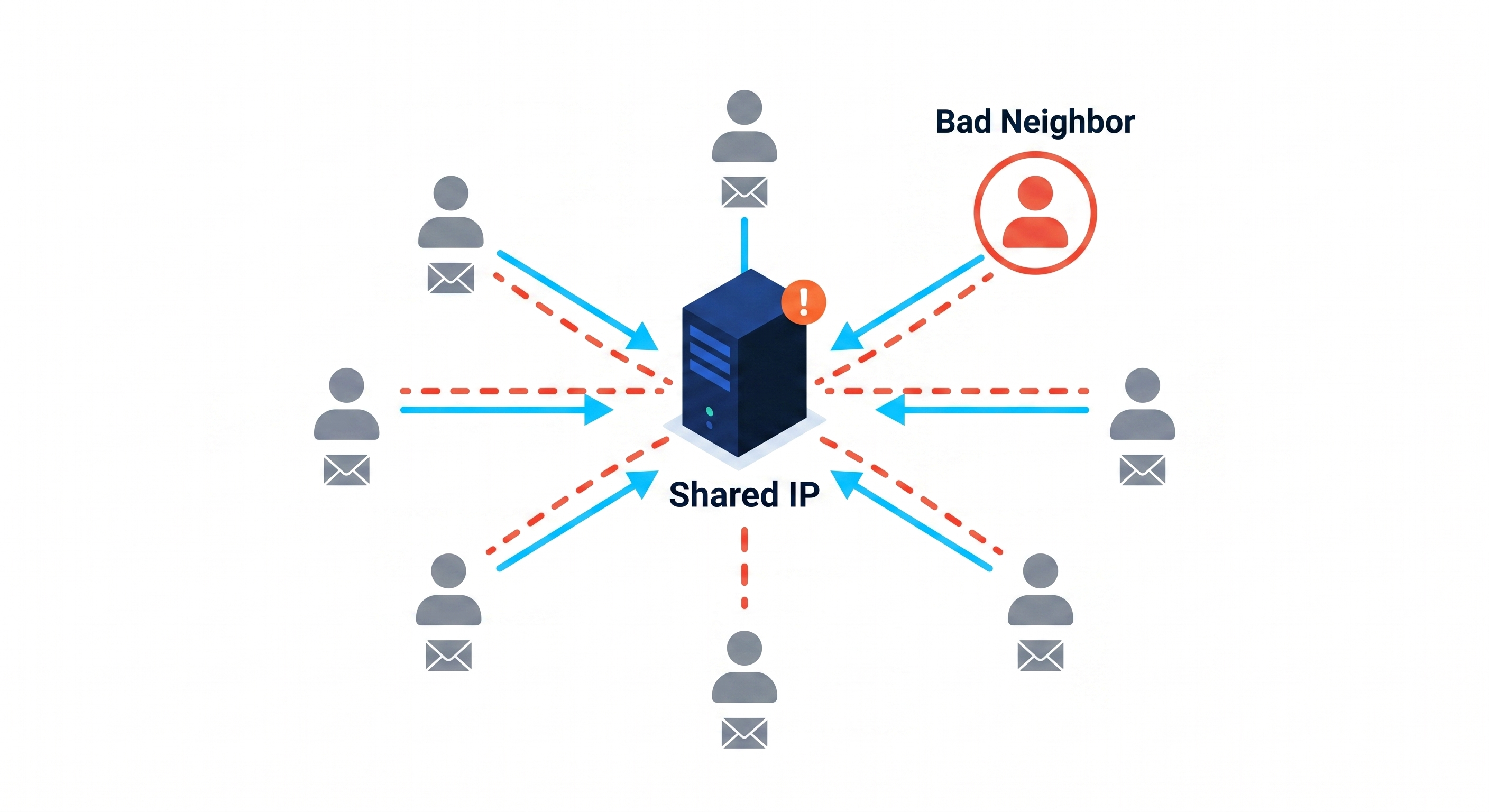 The "bad neighbor" effect is one of the most significant risks of using a shared IP. In this environment, you are sharing a single IP address with dozens or even hundreds of other senders.