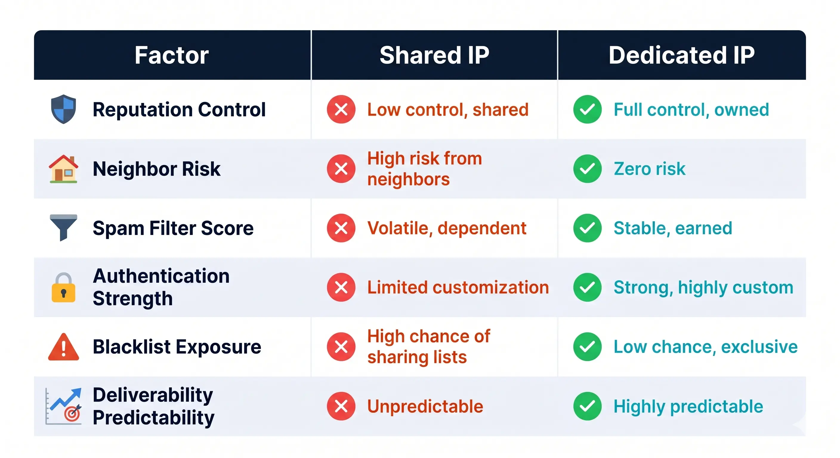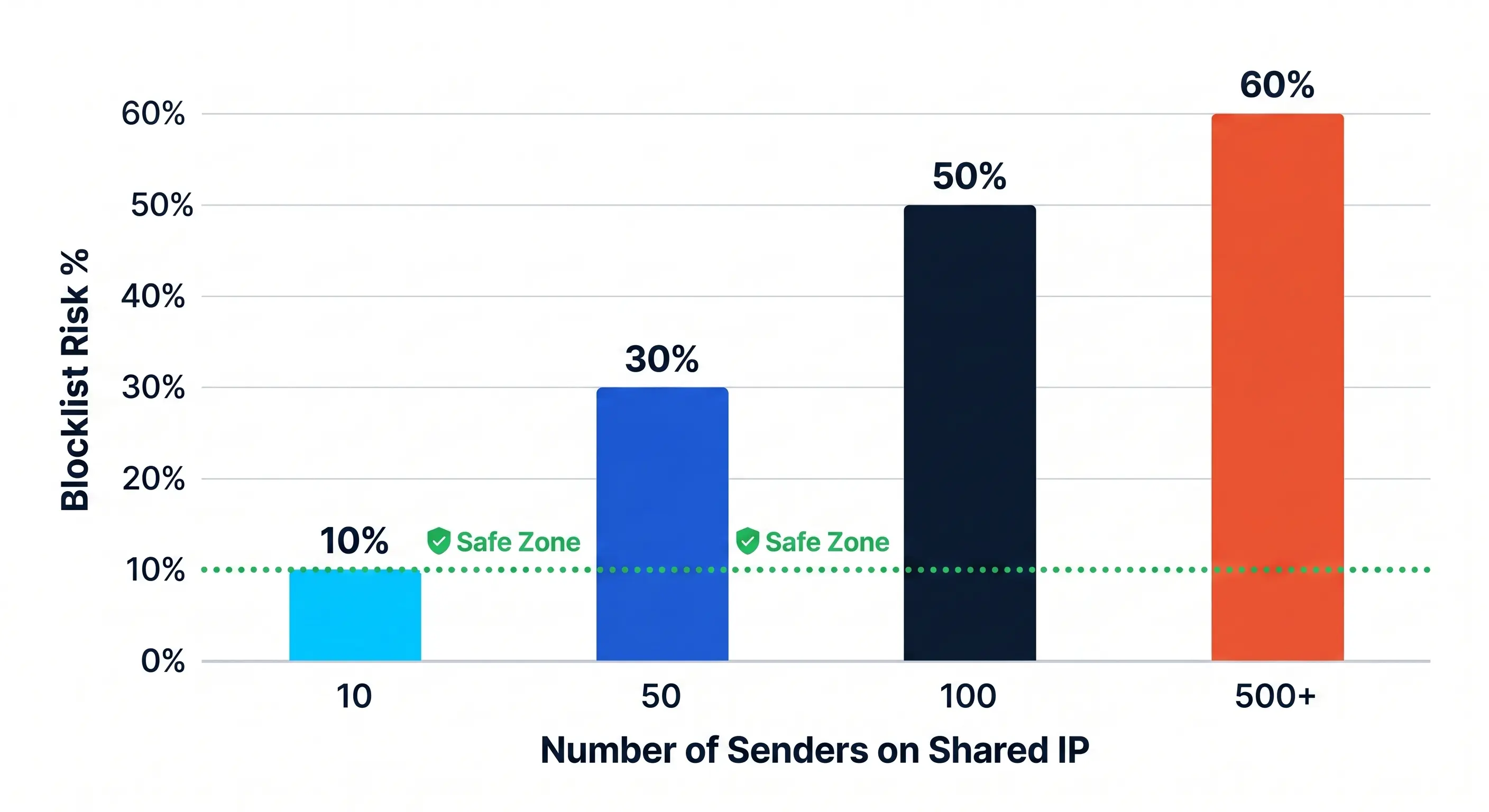 The impact of this shared risk is backed by industry data. According to the [Validity 2023 Blacklisting Report](https://www.validity.com/), shared IP environments are significantly more vulnerable to reputation damage, with data showing that bad neighbors can cause deliverability rates to drop by as much as 10% for innocent senders caught in the crossfire. This "collateral damage" is a primary reason why high-volume senders eventually migrate to dedicated infrastructure to protect their revenue and reach.