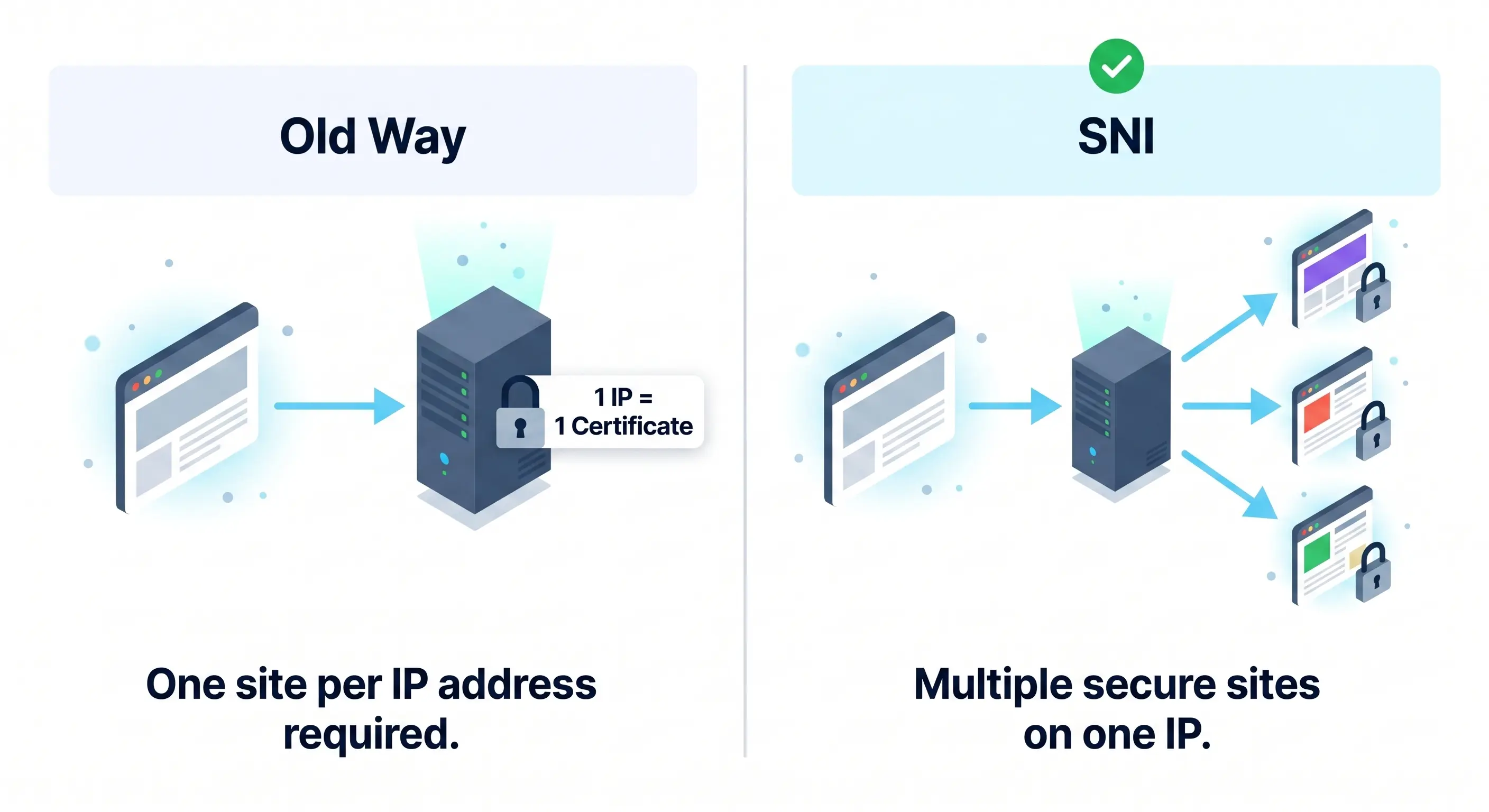 - The Old Way: A server could only "see" the IP address being requested. Because it didn't know the specific domain name yet, it could only provide one SSL certificate per IP. This meant every secure site required its own unique address.