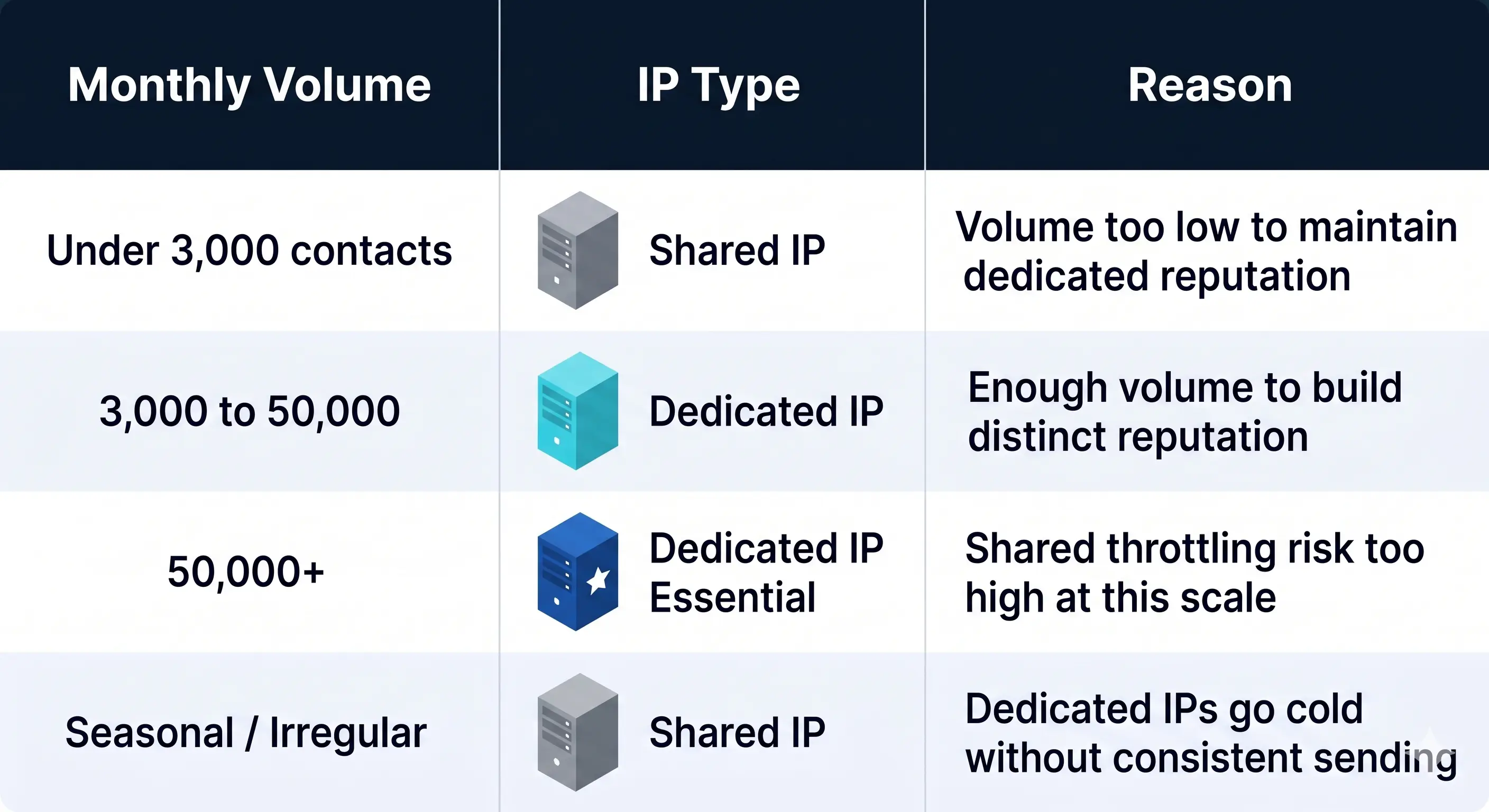 - Inconsistent/Seasonal Senders: Regardless of volume, if you only send once every few months, a Shared IP is better suited to your needs, as it doesn't require the constant maintenance of a dedicated reputation.
