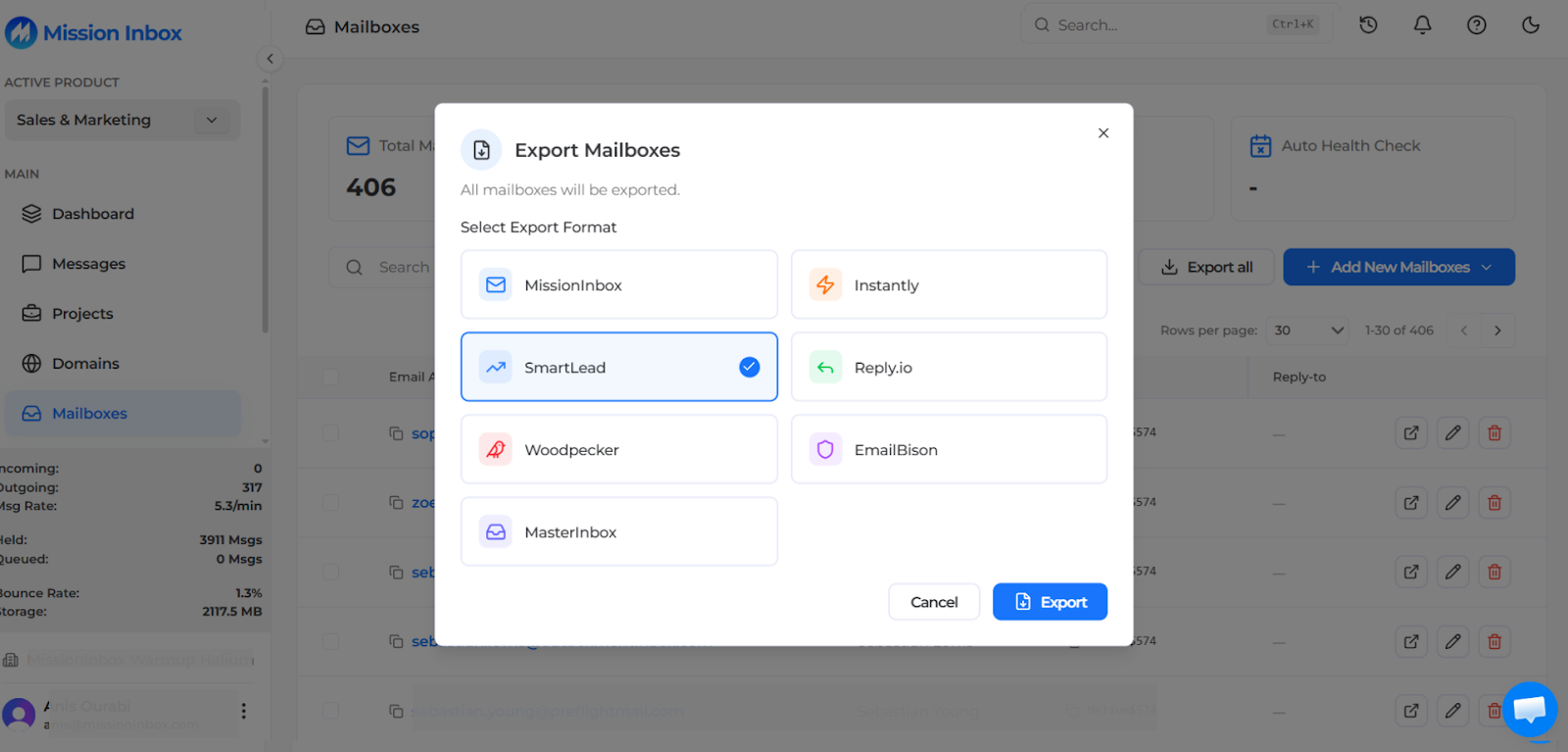 Mission Inbox has a built-in export function for Smartlead. Dashboard, click Export, select Smartlead, and it generates a CSV with every required field. Upload into Smartlead and your campaigns run on isolated infrastructure.