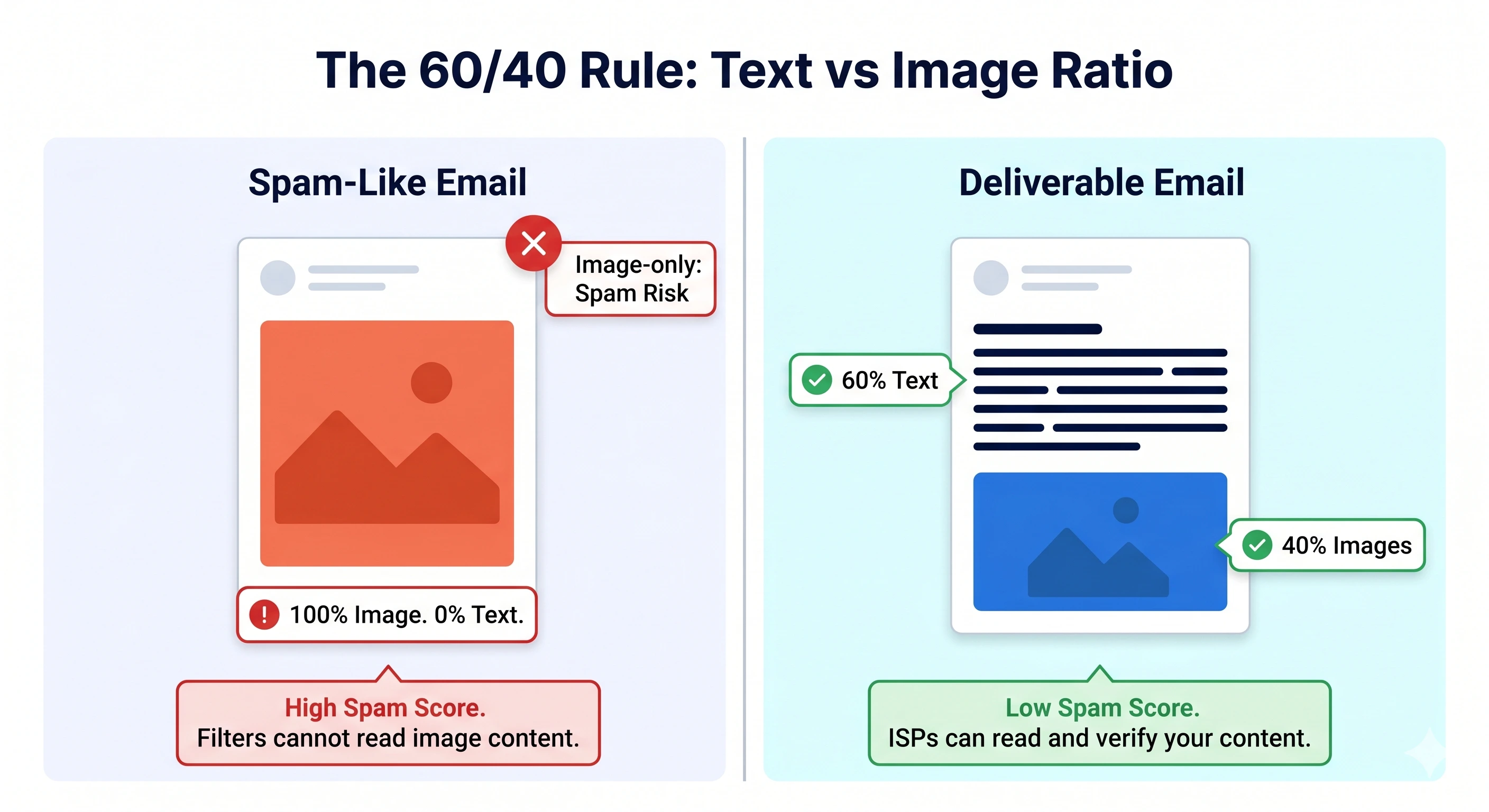ISPs look at the balance between text and visual elements to determine if an email is legitimate. The 60/40 rule requires your email to consist of at least 60% text and no more than 40% images.
