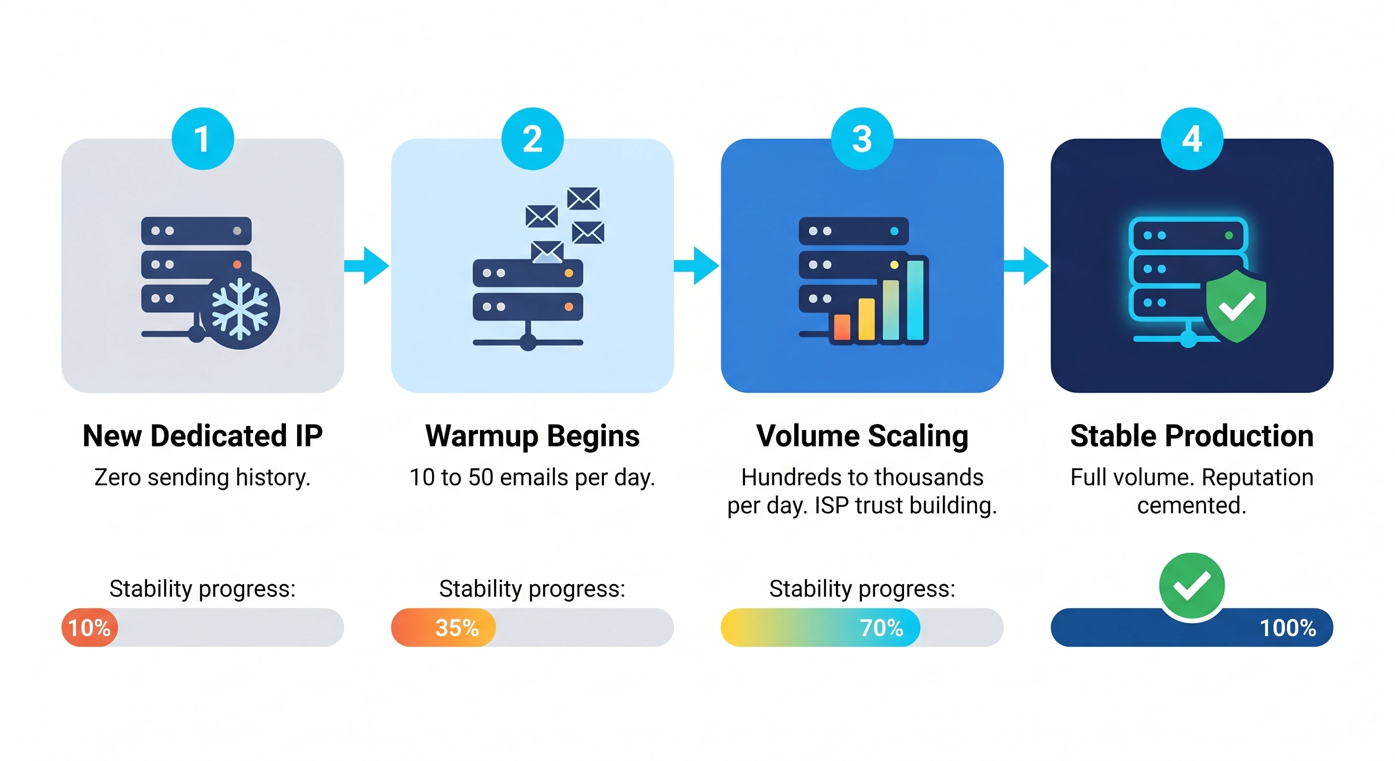 For high-volume senders utilizing a dedicated IP, an automated solution is typically the only viable way to manage the ramp-up phase without risking a permanent blacklisting. An automated system ensures that the volume increases are precise—usually starting with 10-20 emails per day and scaling incrementally over 4 to 8 weeks—to mimic a healthy, growing business.