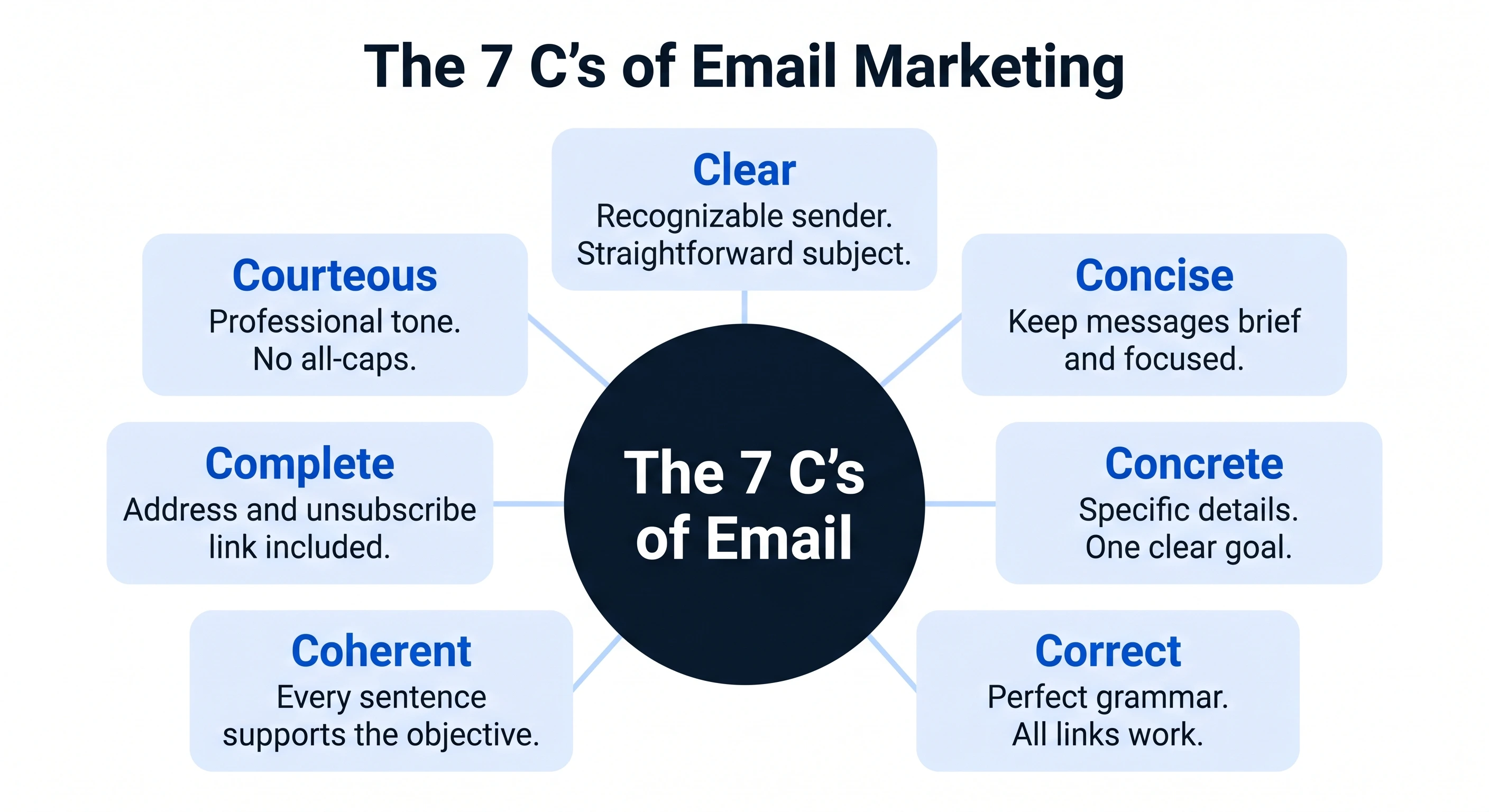 To ensure your emails are both deliverable and engaging, every campaign should be audited against the 7 C’s of email marketing. These principles focus on clarity and professionalism, which directly reduce the likelihood of recipients marking your emails as spam.