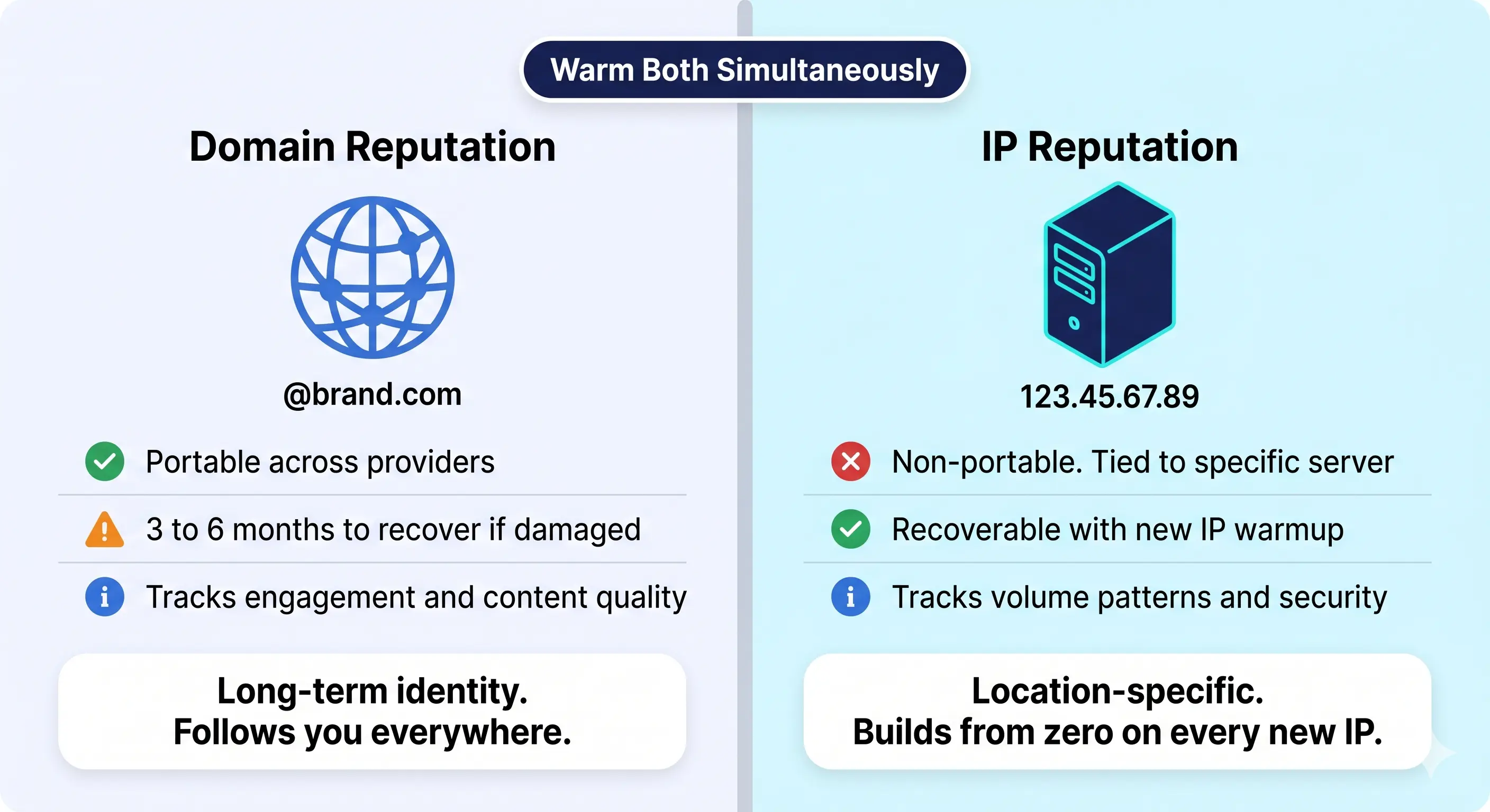 To master the email warm up process, you must understand that mailbox providers (like Google and Microsoft) evaluate your reputation using two distinct identifiers: your domain and your sending IP address. While they work together to determine deliverability, their technical behaviors are fundamentally different.
