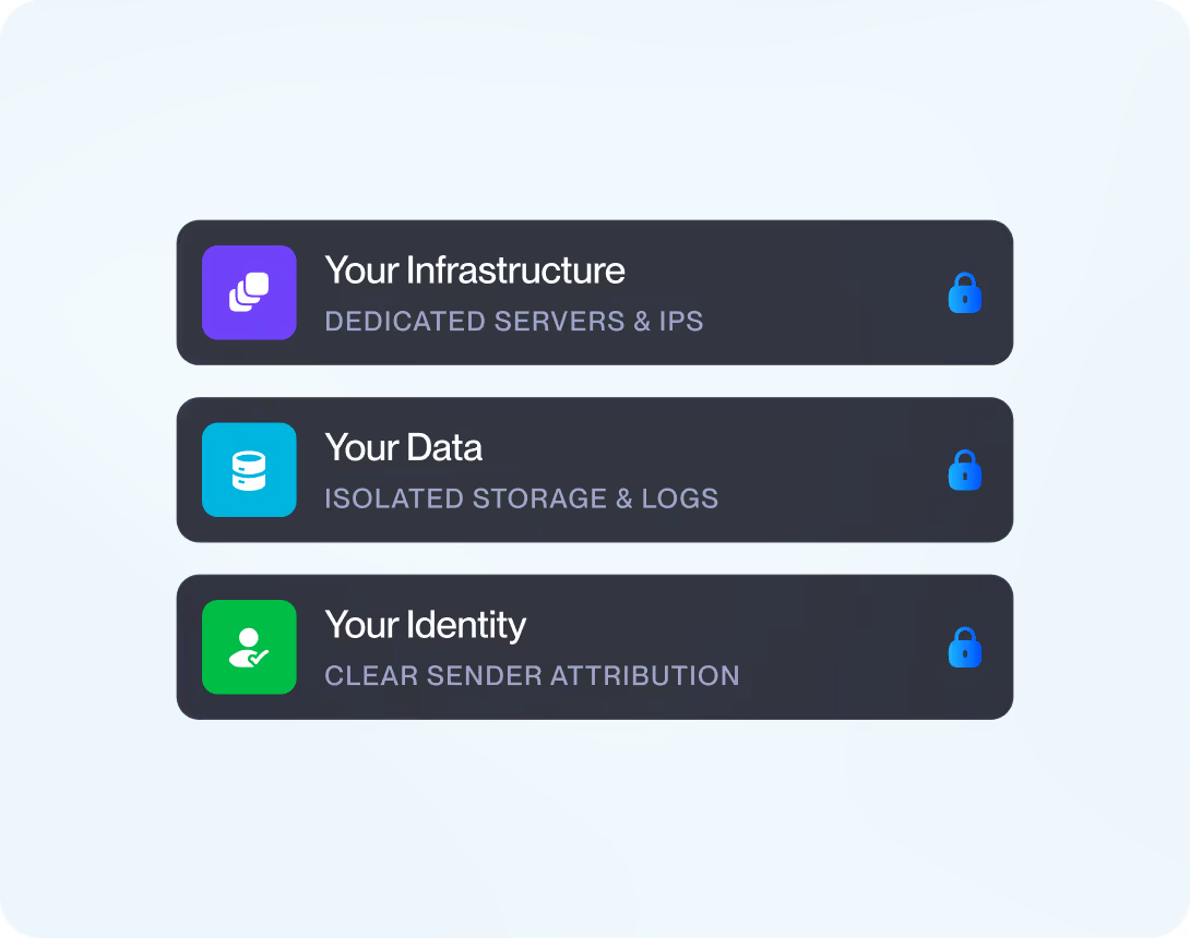 Every customer gets their own isolated infrastructure. No shared resources, no commingled data, no ambiguity about who sent what. Complete ownership and full accountability for every email.